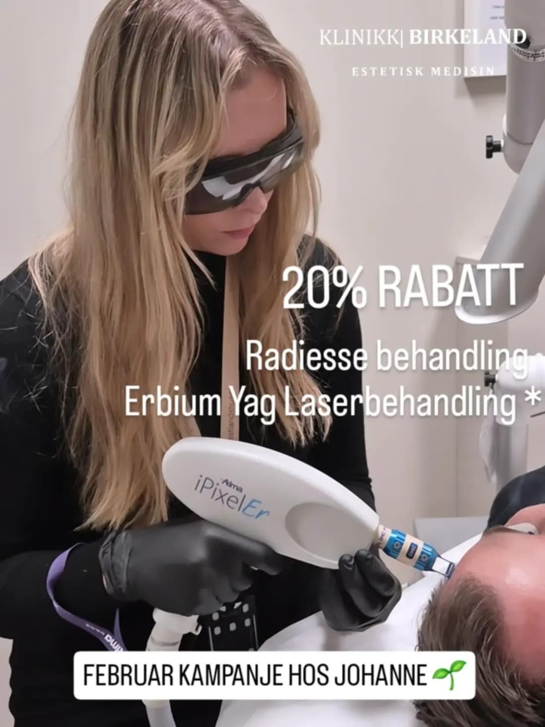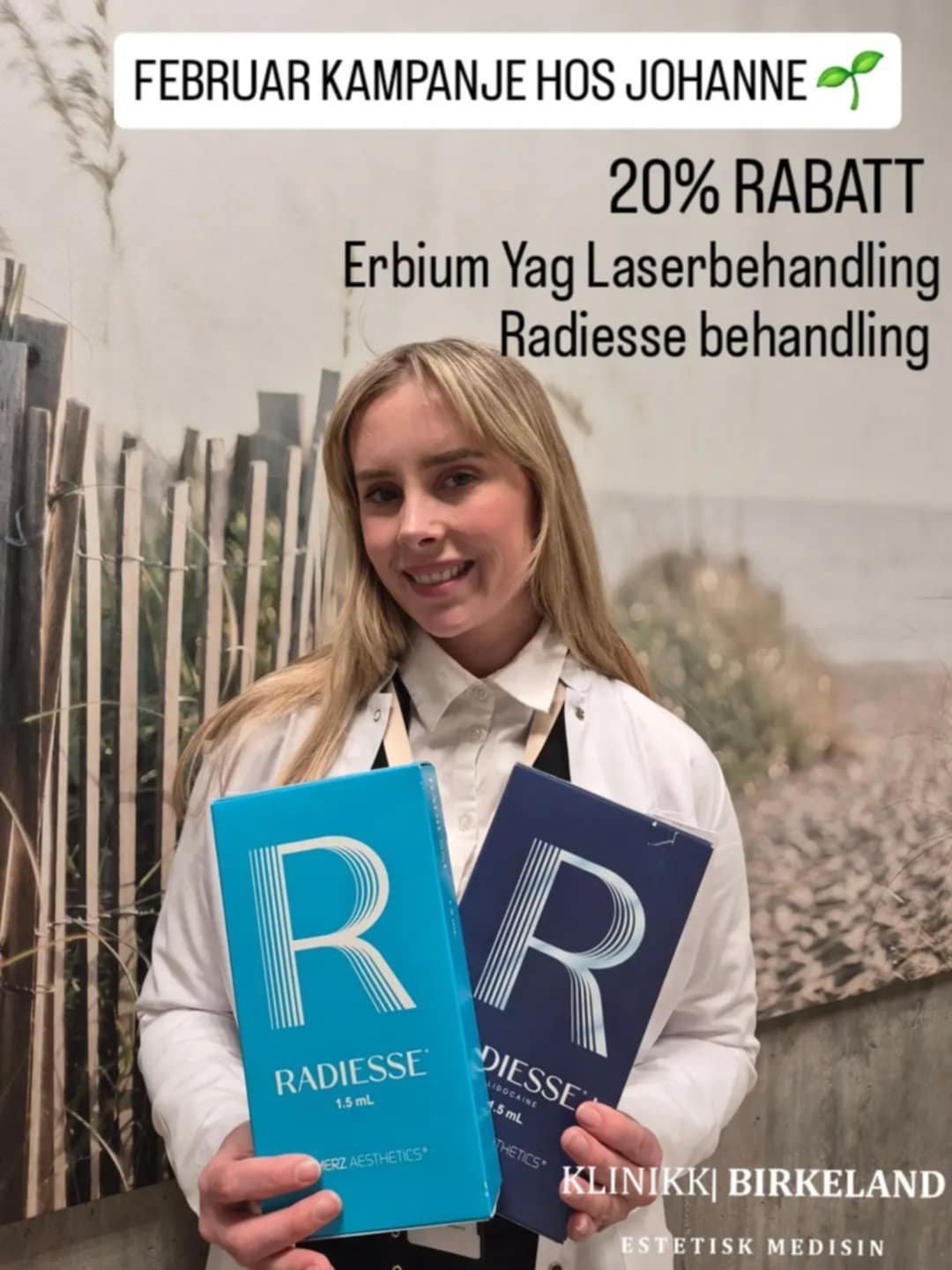 Kosmetisk sykepleier Johanne tilbyr 20% rabatt på behandlingene Erbium Yag og Radiesse injeksjonsbehandling.